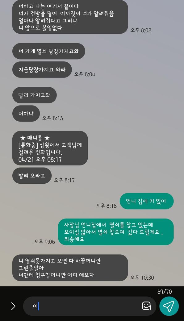 우선 문자 내용 이전 내용은 블로그 작성일 때문에 이렇게 된 상황인데 사장님 성격이 약간 기분 적으로 하는게 있어서 근데 제가 가게 키를 가지고 있어요. 그걸 어디에 뒀는지 까먹어서 찾고 내일 갖다주겠다고 했지만 저렇게 답장이 왔어요