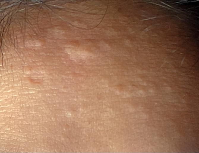 올려주신 사진상 다양한 형태의 넓적한 융기성 병변이 가려움을 동반하고 있다면 두드러기와 같은 알러지 질환