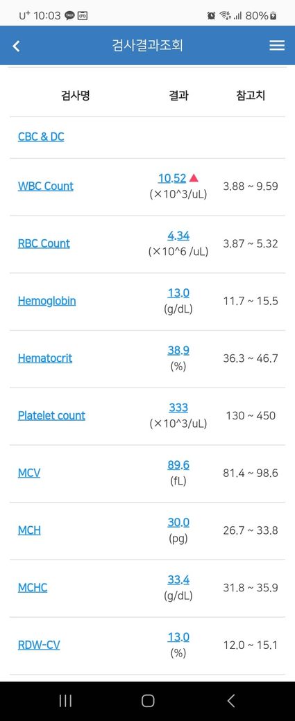 WBC count: 10.52 (참고치 3.88~9.59)