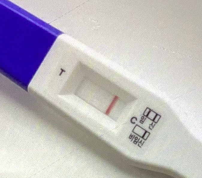 사진상 검사창에는 한 줄만 명확하게 보입니다. 표시 위치상 대조선(C) 으로 보이며, 임신을 의미하는 검사선(T) 은 확인되지 않습니다. 따라서 현재 사진 기준으로는 음성 결과로 해석하는 것이 맞습니다.