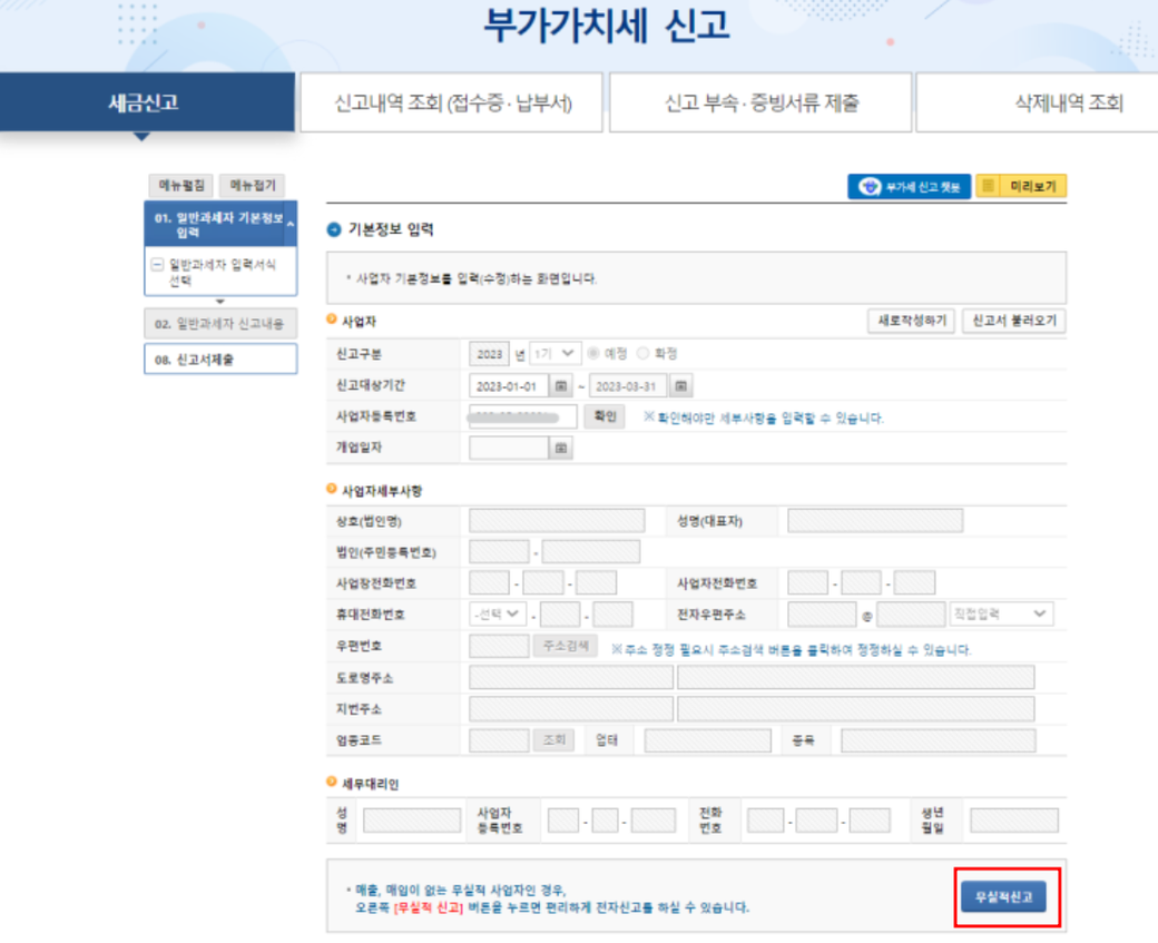 2) 당해 과세기간에 부가가치세 과세표준이 없는 경우 '무실적 신고' 또는 '0'으로 기재