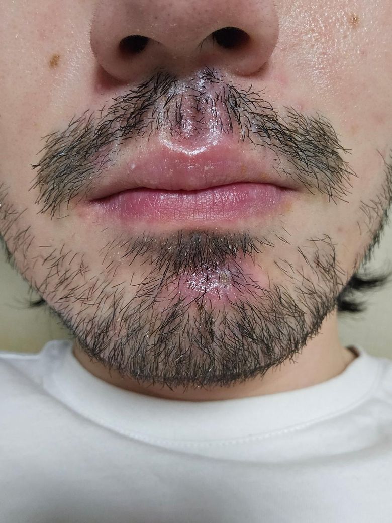 인중과 턱을 아스팔트에 갈려 찰과상을 입었습니다. 2주간 병원에서 드레싱과 세포치료를 받고 이제 흉터관리를 해야하는데 털이 문제네요.
