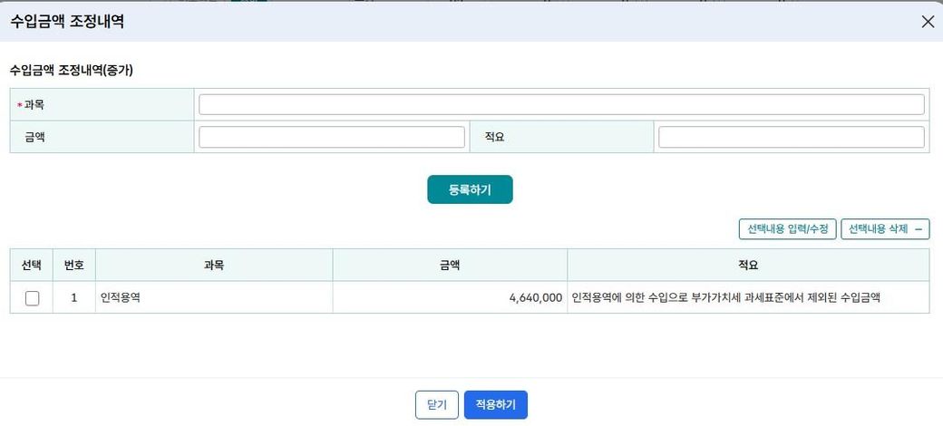 그래서 총수입금액 조정 증가 에 들어가서 인적용역 부분을 증가시켜줬는데, 적요에 "인적용역에 의한 수입으로 부가가치세 과세표준에서 제외된 수입금액" 적었는데 과목은 뭐라고 적어야 할까요? (일단 인적용역 이라고 써두었습니다.)