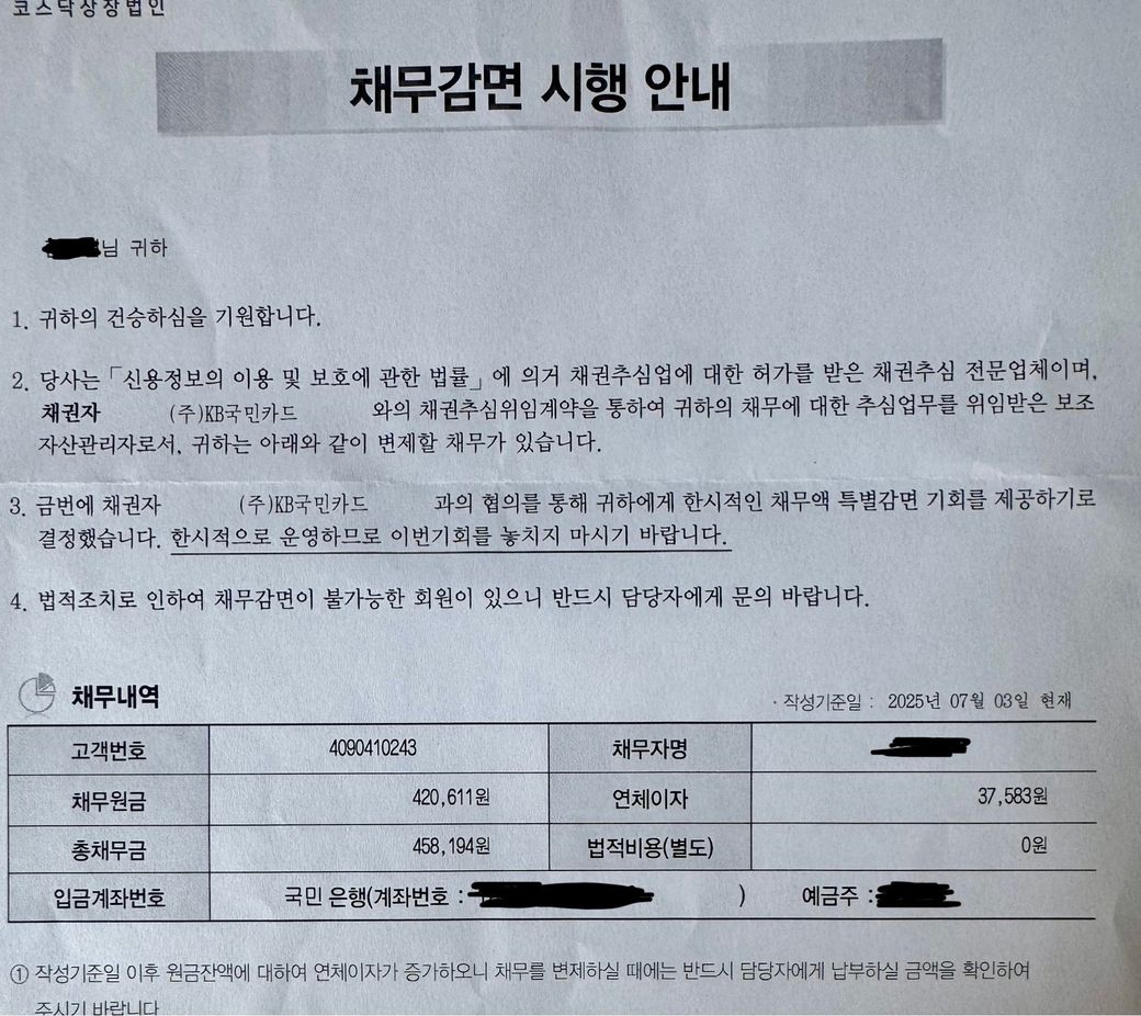 오늘(7/10) 채무감면 시행 안내문이 우편물로 날아왔습니다