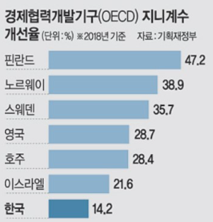 한국의 경우 지니계수가 점점 내려가고 있습니다. 개선율도 OECD 국가 중에 낮은 편입니다. 상위에 있는 국가들 보시면 모두 선진국 다운 국가들임을 알 수 있습니다. "한국이 선진국인가?"라는 질문에 제 개인적 소견은 "아니다!"입니다.