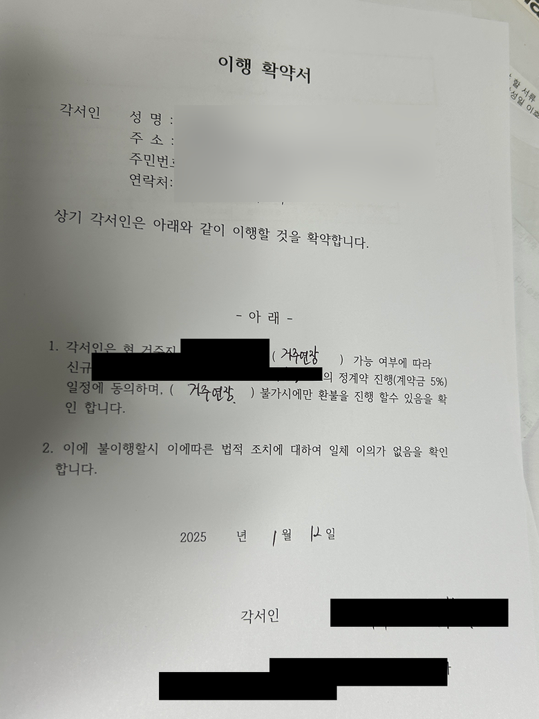 위 사례에서는 이행확약서에 "현 거주지 거주 연장 가능 여부에 따라 정계약 진행 일정에 동의하며, 거주 연장 불가 시에만 환불을 진행할 수 있음을 확인합니다."라는 내용이 기재되어 있습니다.