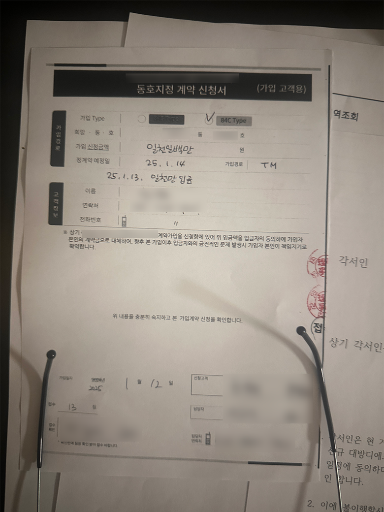 다만, 현재 거주 중인 아파트는 공공지원 민간임대 아파트로, 분양권을 구매할 경우 유주택자로 간주되어 계약 갱신에 문제가 생길 수 있다는 점이 우려되어 담당자에게 “평일에 임대사무소를 통해 확인 후 다시 말씀드리겠다”는 의사를 전달했습니다. 이에 담당자는 “하루 차이라도 동·호수 지정 계약금을 우선 걸어두고, 계약 갱신 여부에 따라 특별히 환불도 해주겠다”고 안내하였습니다. 이 안내에 따라 동·호수 지정 계약서와 이행확약서를 작성하게 되었습니다.