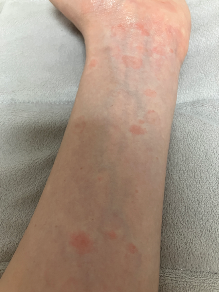 사진을 봤을 때는 급성 두드러기의 가능성도 있으나 정확하게는 직접 전문의가 육안으로 보는 것이 좋습니다.
