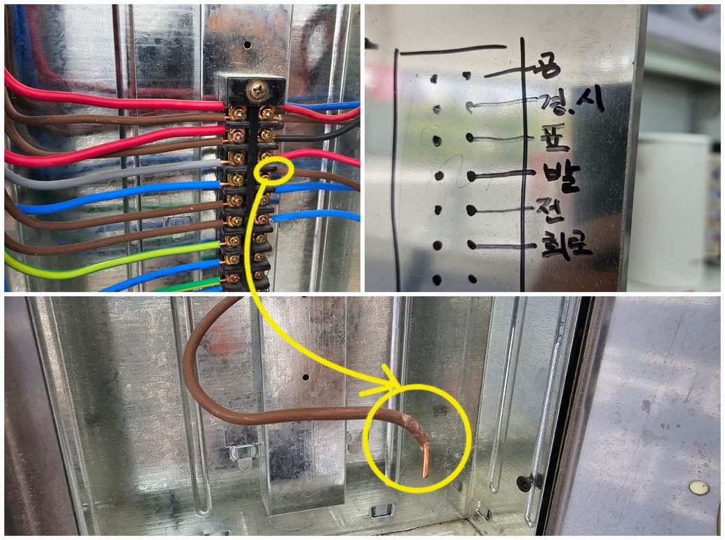안녕하세요 발신기함 안을 보니 사진과 같이 갈색 전선이 연결이 안되어 있는데요 이런 경우는 발신기 작동에 문제가 있는 것인지?