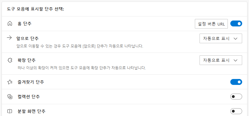 엣지를 사용하신다면 엣지에서 마우스 오른쪽을 눌러 도구모음사용자지정을 누르시고 그리고 내리다보면 홈단추를 나오게 할것인지 아닌지 선택하는 칸이 나옵니다.