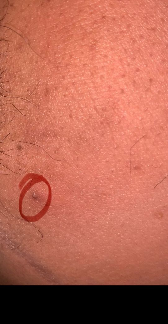 빨간 동그라미 부분에 있는 약간 검은색이나 회색같은 병변 입니다 단순 모낭염일까요? 아님 곤지름 일까요?