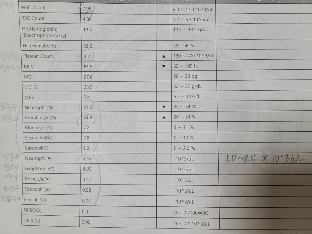4개월전 가와사키 진단 받은 21개월 남자아기입니다. 혈액검사상 혈소판 수치가 45만으로 아직 정상이 아닌데 교수님은 괜찮다하시네요. 그리고 호중구, 림프구 수치가 정상범위가 아닌 것 같은데 해석 부탁드립니다.