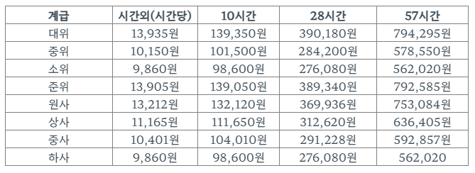 여기 추가 근무수당표인데 굉장히 짜지요..