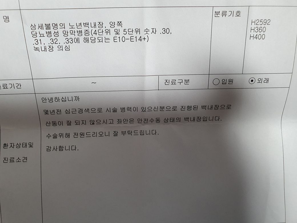 안과검사에서 백내장과 당뇨성 망막질환이 나왔는데 해석좀 부탁드립니다