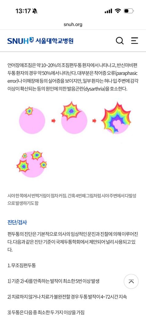 말씀하신 “번쩍임이 점점 커졌다가 사라지고 반복되는 시야 이상 + 이후 두통” 양상은 전형적인 편두통 중에서도 전조가 동반된 형태(시각 전조)에 매우 합당합니다. 특히 양쪽 눈에서 보이고, 눈을 감아도 보이며, 점차 퍼지듯 커졌다가 사라지는 패턴은 망막 질환보다는 뇌의 시각피질에서 발생하는 현상으로 해석하는 것이 일반적입니다.