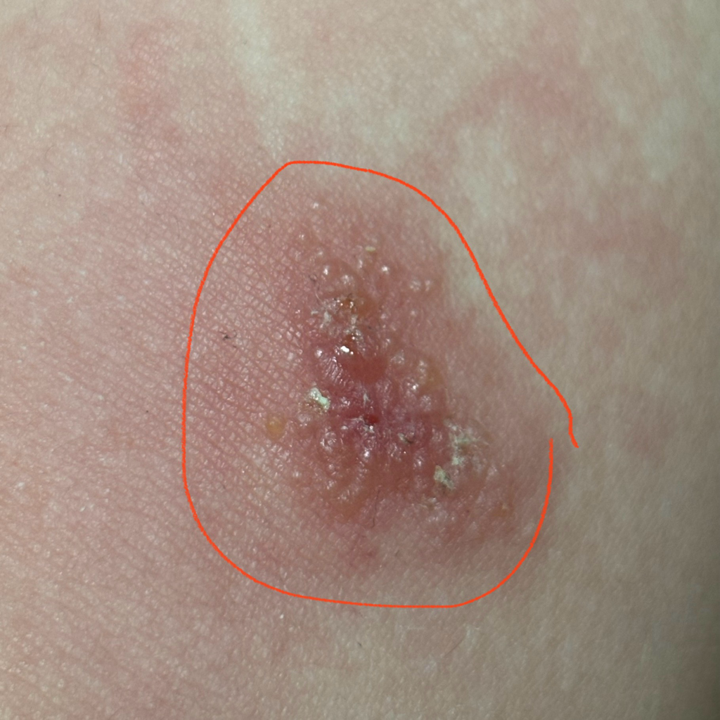 계속 가려워서 버물리도 발라보고 연고도 발라봤는데 도저히 낫는 거 같지 않네요.. 첨부한 사진에 그려져있는 동그라미 선대로 부풀어올라있어요..