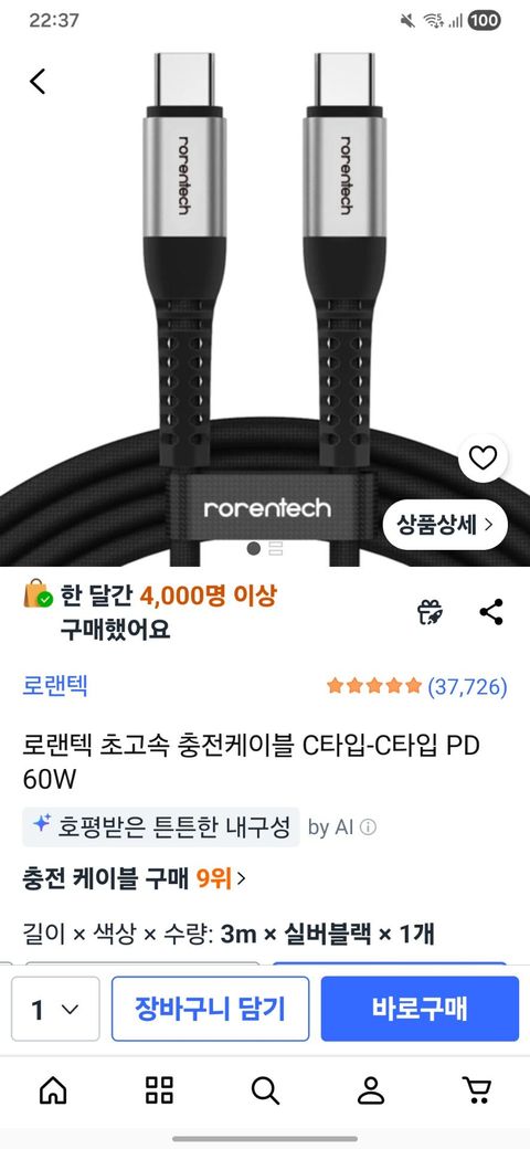 재가 이번에 긴 충전기가 필요해서 이걸로 구매했는데요 현쟈 제가 어댑터 쓰는 제품이 다이소 솔루엠 25w 어댑터거든요?