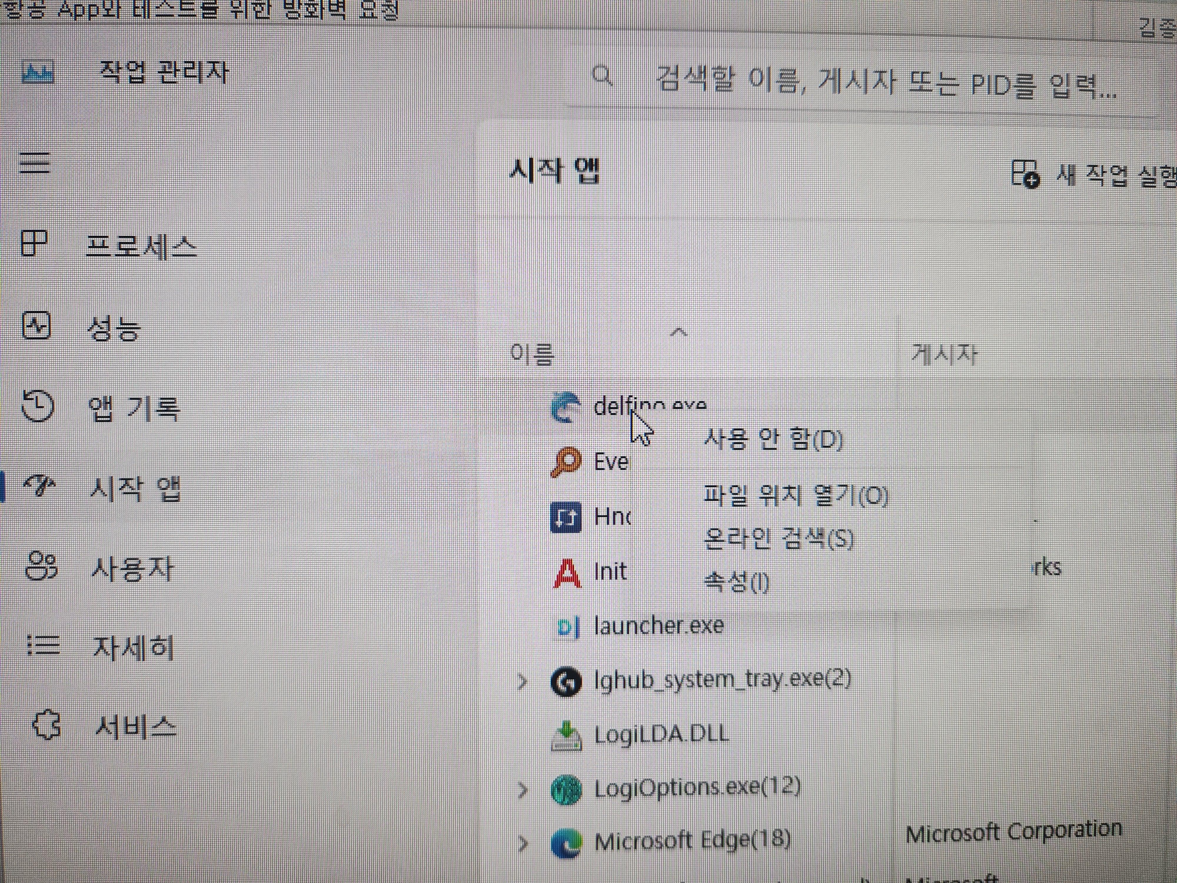 또하나 작업관리자를 실행하신 후에 왼편 메뉴에서 '시작앱'에서 불필요한 프로그램을 제거 또는 사용안함으로 변경하세요