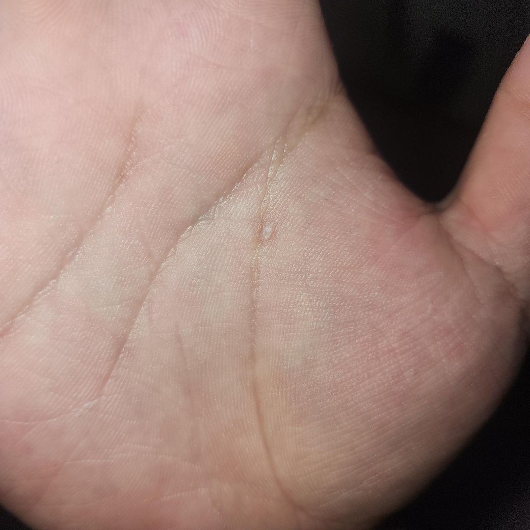 사진상 병변은 작은 백색 각질성 구진으로 보이며, 중심부가 약간 단단해 보입니다. 손바닥이라는 위치를 고려하면 사마귀 가능성은 있습니다. 다만 전형적인 사마귀에서 흔히 보이는 점상 출혈(검은 점)이나 피부선의 단절이 뚜렷하게 확인되지는 않아, 초기 병변이거나 단순 각질 병변(티눈, 국소 각화)과 감별이 필요합니다.