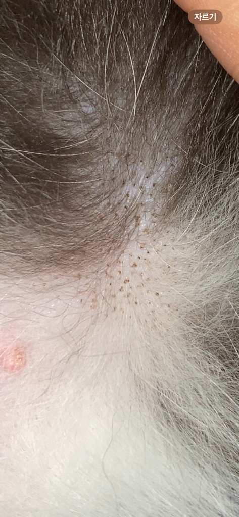 검은 점점들은 과거 피부병을 앓았거나 지금도 있는 것일 수 있고 그무밍하다가 침이 먼지와 붙어서 생겼을 수도 있겠네요