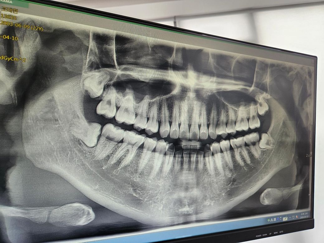 일딘 아래쪽 사랑니는 양쪽 모두 누워있어 발치하시는게 좋겠습니다만, 엑스레이상 양쪽 모두 신경과 맞닿아있는 것으로 보여 일단 3차원적인 영상판독이 필요해보입니다. 윗쪽 사랑니는 반드시 뽑아야할 필요는 없으나 음식을 저작하는 기능을 전혀 하지 않고, 깊숙한 곳에 위치하고 있어 양치가 어렵기 때문에 추후 문제를 일으킬 가능성이 높으므로 가능하면 뽑기 쉬울 때 미리 뽑는것이 좋다고 생각합니다. 나이가 들 수록 뼈와 단단하게 붙어버리기도 하고, 충치나 염증이 생기면 더 뽑기가 힘들어지기 때문에 가능하면 미리 뽑아주는게 더 좋습니다. 아래 사랑니는 꼭 ct찍어보시고 전문의의 소견에 따라 결정하시는게 좋겠습니다.
