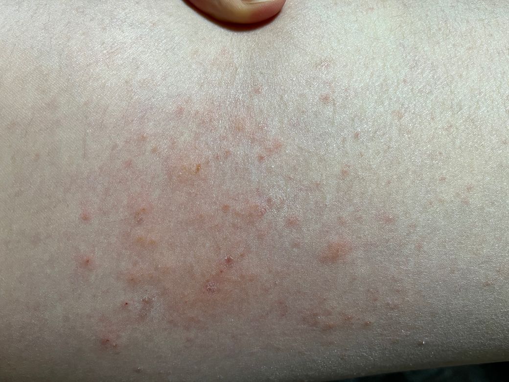 다발성의 구진과 발진이 관찰되고 있으며 가려움이 동반되어 알러지 피부염이나 습진 같은 피부염에 합당한 소견입니다. 주로 성관계에 의해 발생하는 헤르페스 2형 감염은 다양한 양상으로 나타날 수 있지만 수포성 병변으로 나타나는 것이 일반적입니다. 따라서 상기 병변이 발생한 부위가 허벅지라면 위에서 언급한 것과 같이 알러지 피부염이나 두드러기와 같은 피부 질환 가능성이 높습니다. 따라서 상기 병변이 호전되지 않는다면 피부과 내원하여 진료를 보시는 것을 권해드립니다.