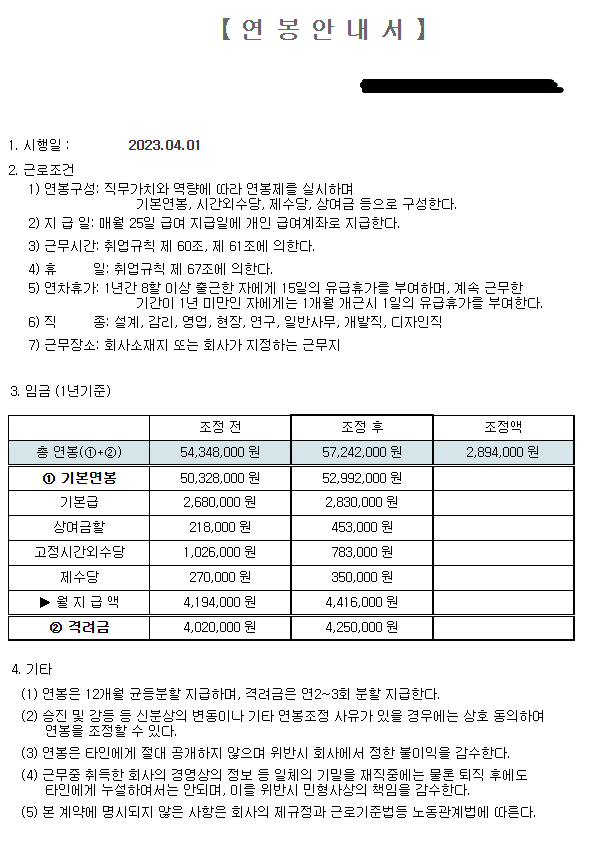 저희 회사가 4월1일에 연봉계약을 하는데 총 연봉에 격려금이 포함되어 있습니다.