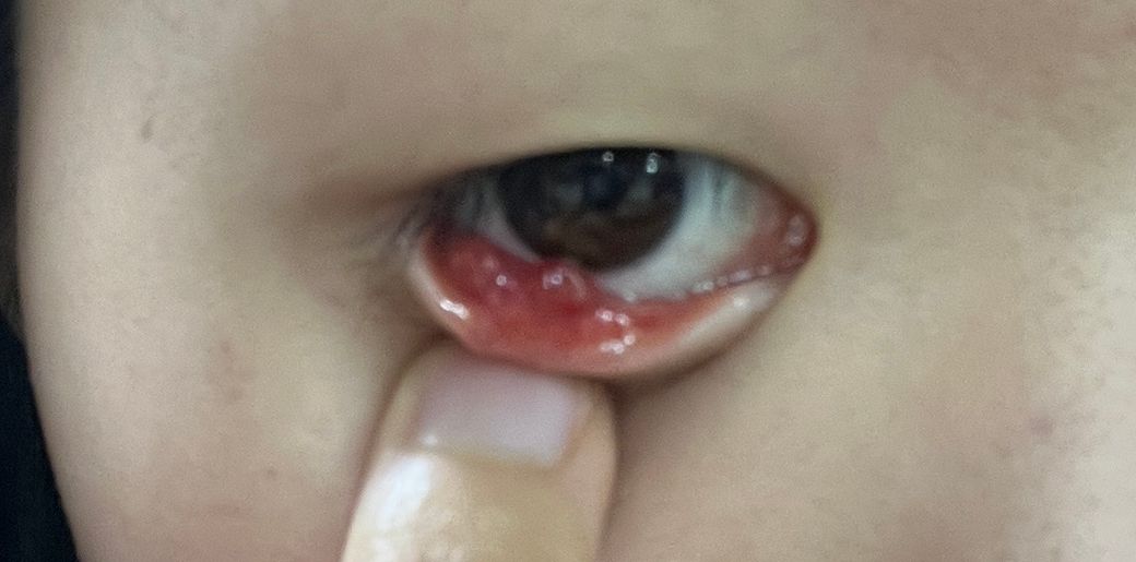 사진상 아래 눈꺼풀 안쪽 결막이 붉게 부어 있고 둥글게 돌출된 병변이 보입니다. 형태상 가장 흔히 생각되는 것은 결막 결석(conjunctival concretion) 주변 염증, 또는 마이봄샘 막힘으로 생기는 초기 다래끼(내맥립종) 가능성입니다. 두 경우 모두 아래 눈꺼풀 안쪽 결막에서 비교적 흔하게 발생합니다.
