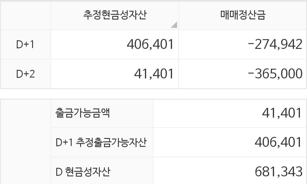 그리고 당일 추가로 주식을 매수하여 D+2일에 365,000원의 추정현금성 자산이 감소하게 되는 것입니다.