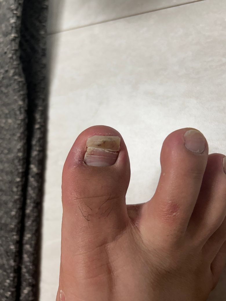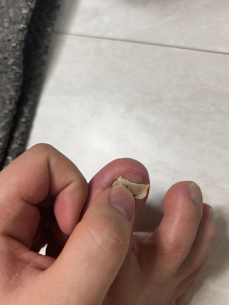 세균감염의 우려가 있기 때문에 손상부위의 발톱을 만지거나 스스로 제거 하지마시고 병원에서 제거하셔야 하며 젖은 양말이나 통풍이 잘 되지 않는 신발은 착용하시지 마시고 슬리퍼 등 통풍이 잘 되는 신발을 신어주시고 소독 자주 해주시고 손상 받은 발톱은 밴드로 감싸주시는 것이 좋습니다.