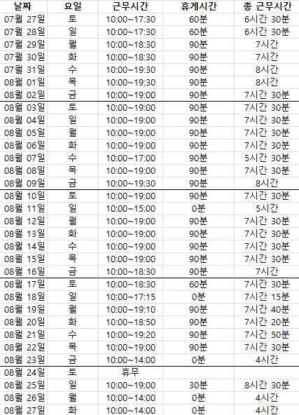 7.27(토) 부터 8.23(금) 까지 하루로 빠짐없이 근무를 하였습니다.