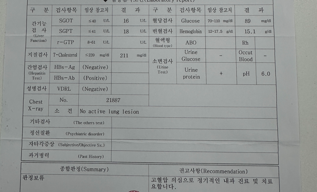 보고받으신 소변검사 결과 중 문제가 있는 부분은 urine protein(요단백) 입니다. 단백질이 소변에서 검출되었다는 것이고, 검출된 강도가 +(one positive) 이므로 많지는 않은 상태입니다. 재검이 필요할 수 있으니 내과를 방문해보시는게 좋겠습니다.