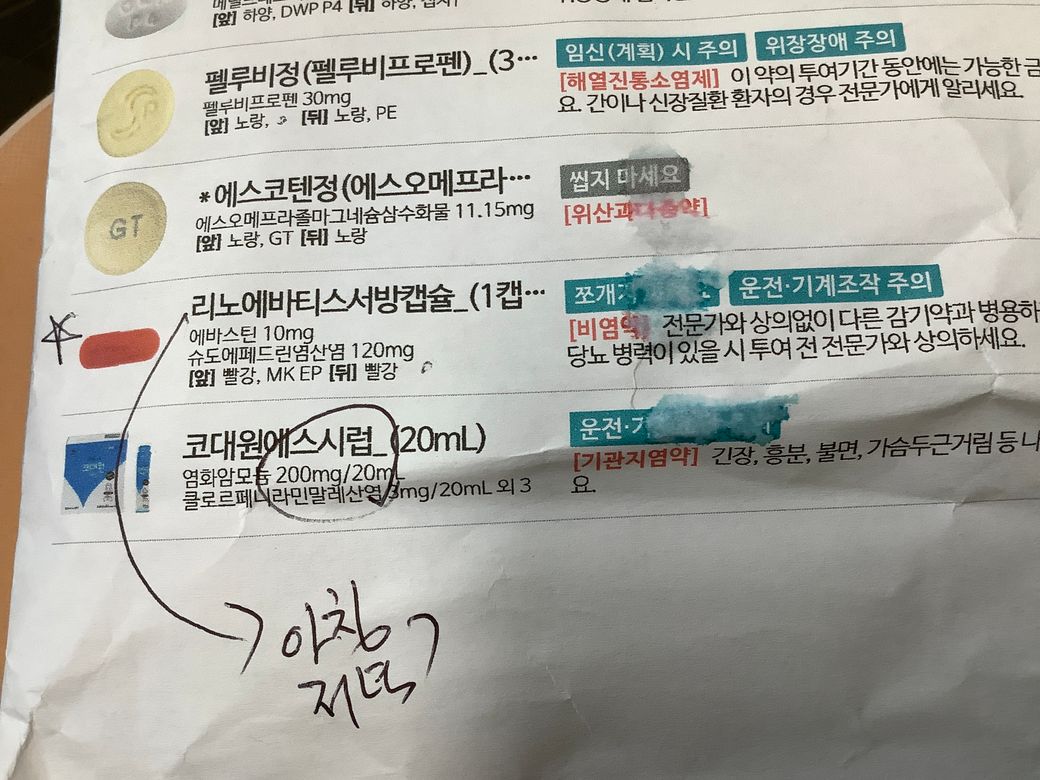 졸음을 유발할 수 있는 약인 리노에바티스서방캡슐, 코대원에스시럽을 복용하지 않고 다른 약으로 변경하시길바랍니다.