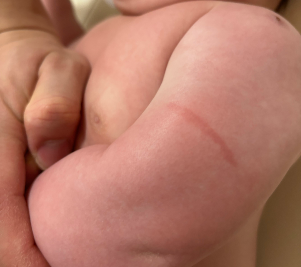 많이 속상하실 것 같습니다. 사진만으로는 알기 어려우나 일시적이지 않다면 화상 자국이 의심됩니다. 진찰을 위해 소아과나 피부과를 방문 해보시기 바랍니다.