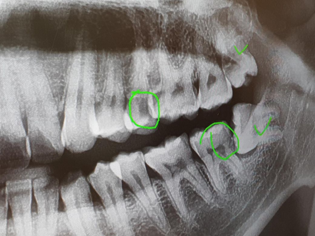 그럼에도 불구하고 아래 위 치아 2개다 충치가 있을 가능성이 매우 높아 보입니다.