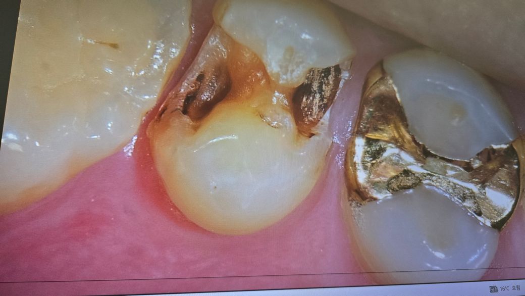 아무래도 금 인레이 보철을 한 지 오래되었다면 내부는 충치도 생길 수 있고 보철물 접착제가 산화, 부식된 것도 있습니다. 충치의 경우 색상을 봐서는 급격하게 진행중인 충치는 아닐 가능성이 높을 것 같습니다.