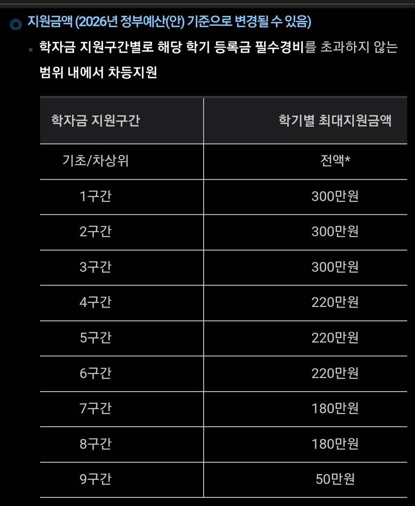 1~3구간: 학기별 최대 300만원, 연간 최대 600만원 지원이 됩니다.