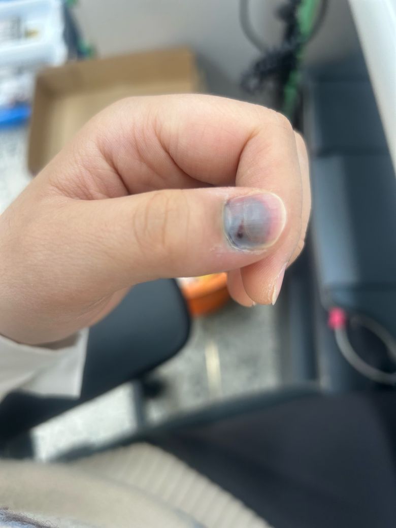 사진상 "손톱 밑 피멍(조갑하혈종)"과 타박상 소견이 강해 보입니다.
