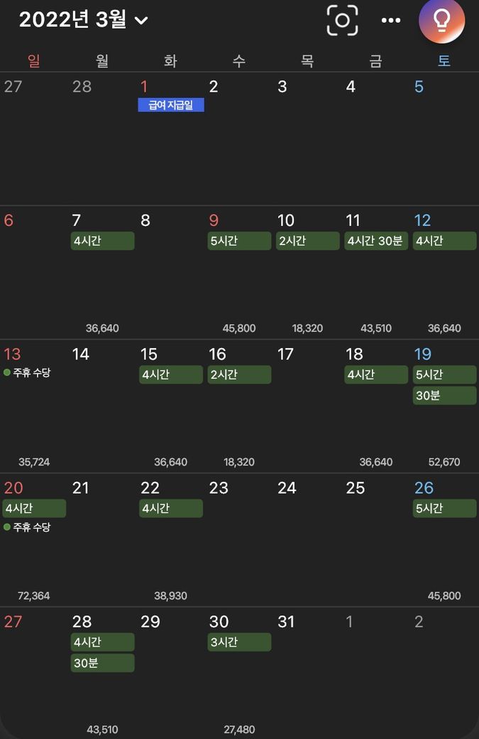 3월달이 첫 출근이구 매월 10일날 월급을 준다해서 (2월 한달동안 출근할 금액을 다음달인 3월 10일날 받는 식인거) 3월 둘째주인 3월 7일부터 출근을 했습니다. 아래 사진에 첨부하겠습니다