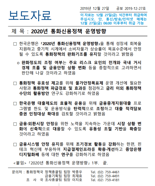 한국은행 2020년 통화신용정책 운영방향 보고서에 따르면, 마지막에 중앙은행 디지털화폐에 대한 연구를 강화하기로 하였다는 보도자료가 있습니다.