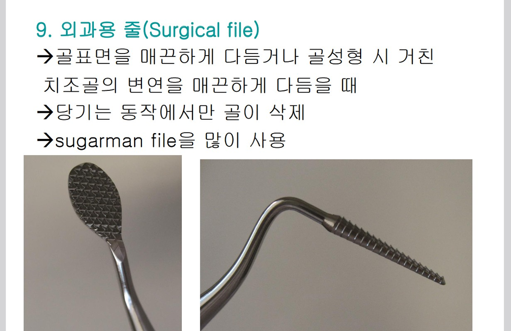 Surgical file (외과용 줄) : 골표면을 매끈하게 다듬거나 골성형 시 거친 치조골의 변연을 매끈하게 다듬을 때 사용