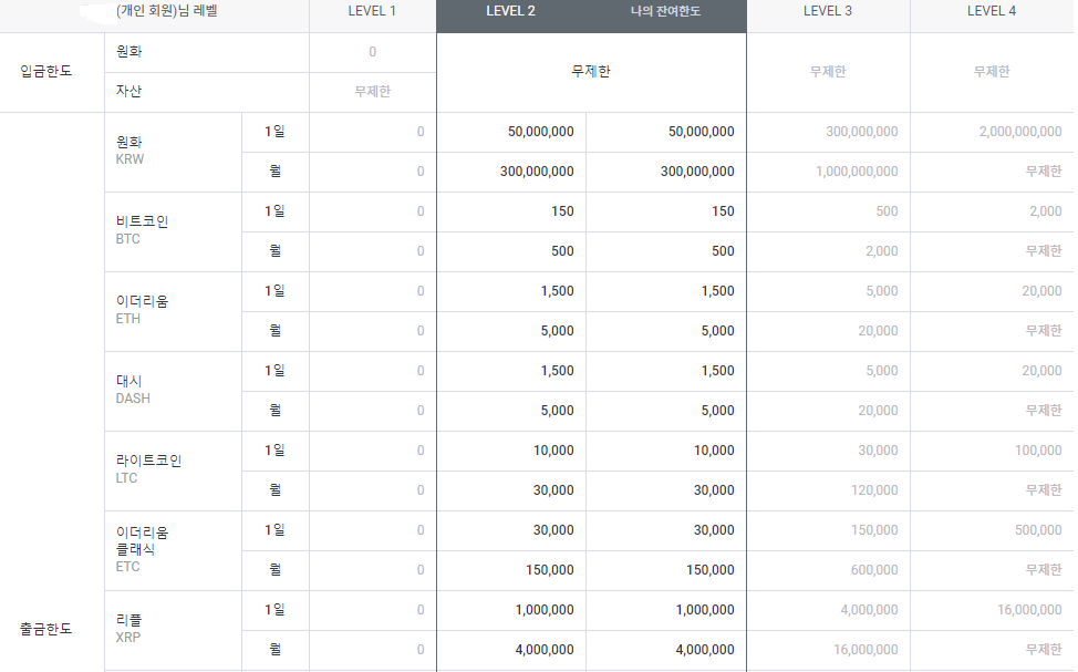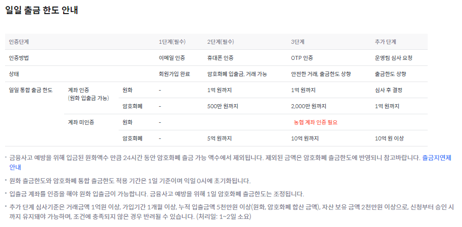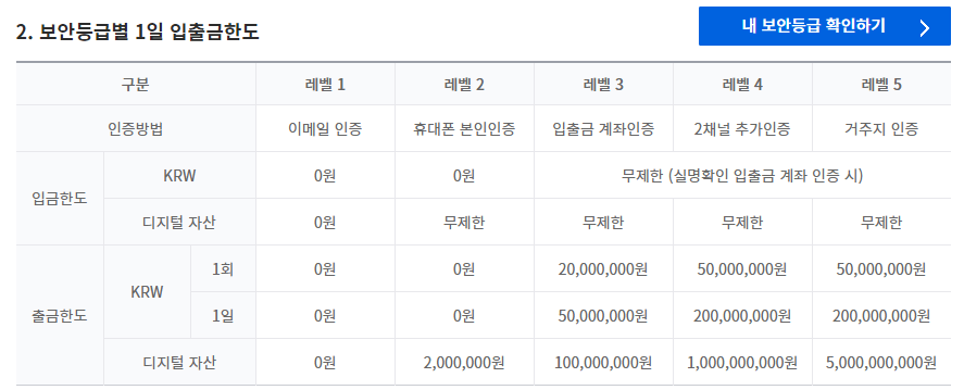 아래는 업비트거래소의 보안등급별 입출금한도입니다.