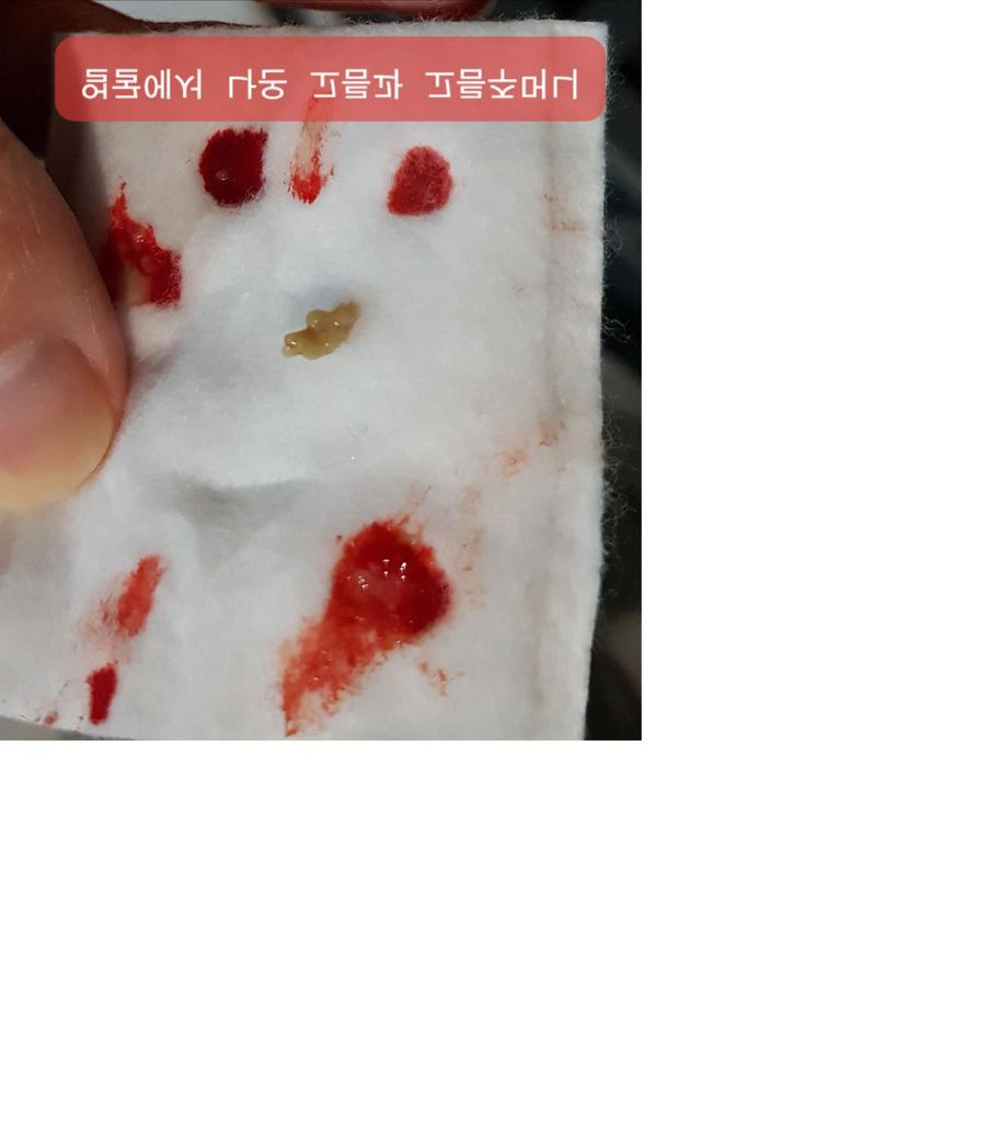 추가로 연관이 있는지는 모르겠는데 오른쪽 얼굴에도 엄청 큰 농양이 두개가 생겼는데(딱지 모양은 위와 달랐음) 작정하고 짜니 큰 구멍에 화장솜에 피뭍은 사진속에 저 노란색 덩어리가 박혀있었습니다. 집게로 잡아빼내고 소독하고나서 다음날 바로 아물었구요. 몸살이나 근육통등은 없었습니다.