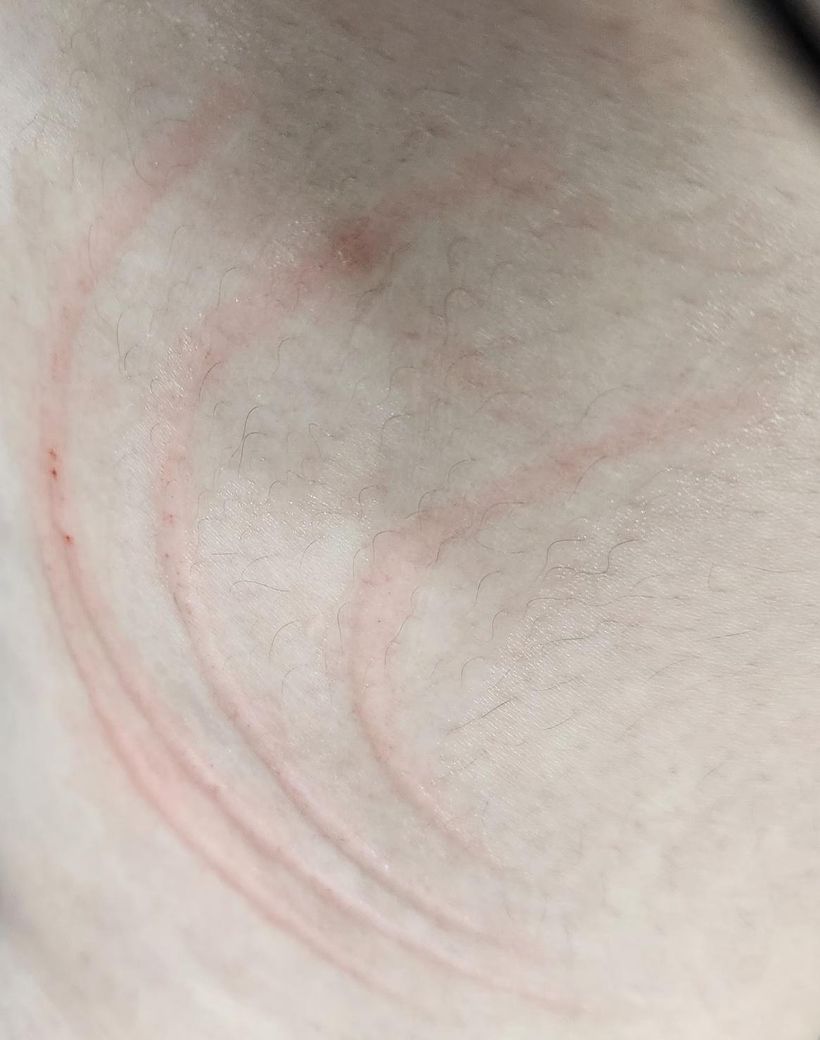 사진의 소견은 긁히게 되면서 생긴 상처로 보이며, 해당 소견 자체는 크게 문제될 것 없습니다. 다만 알러지로 인한 전신의 혈관부종, 가려움증, 쇼크 증상이 발생한다면 병원에 빨리 가서 조치를 받으시는 것이 적절하겠습니다.