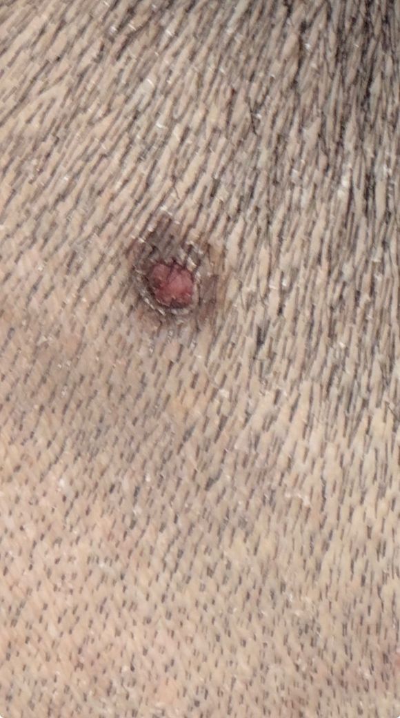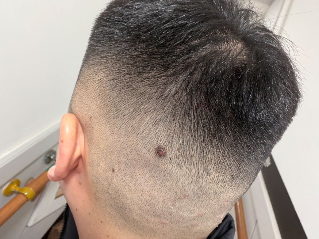 사진상 병변은 둥글고 비교적 경계가 뚜렷하며, 중심부가 붉게 융기되어 있고 주변에 색소 침착이 동반된 형태입니다. 반복적으로 염증이 생긴다는 점을 고려하면 단순 여드름보다는 색소성 모반(점) 위에 이차적으로 모낭염이나 자극성 염증이 반복되는 상황 가능성이 있습니다. 두피는 피지 분비가 많고 면도나 손으로 짜는 자극이 반복되면 모반 표면이 쉽게 손상되어 염증이 재발할 수 있습니다.