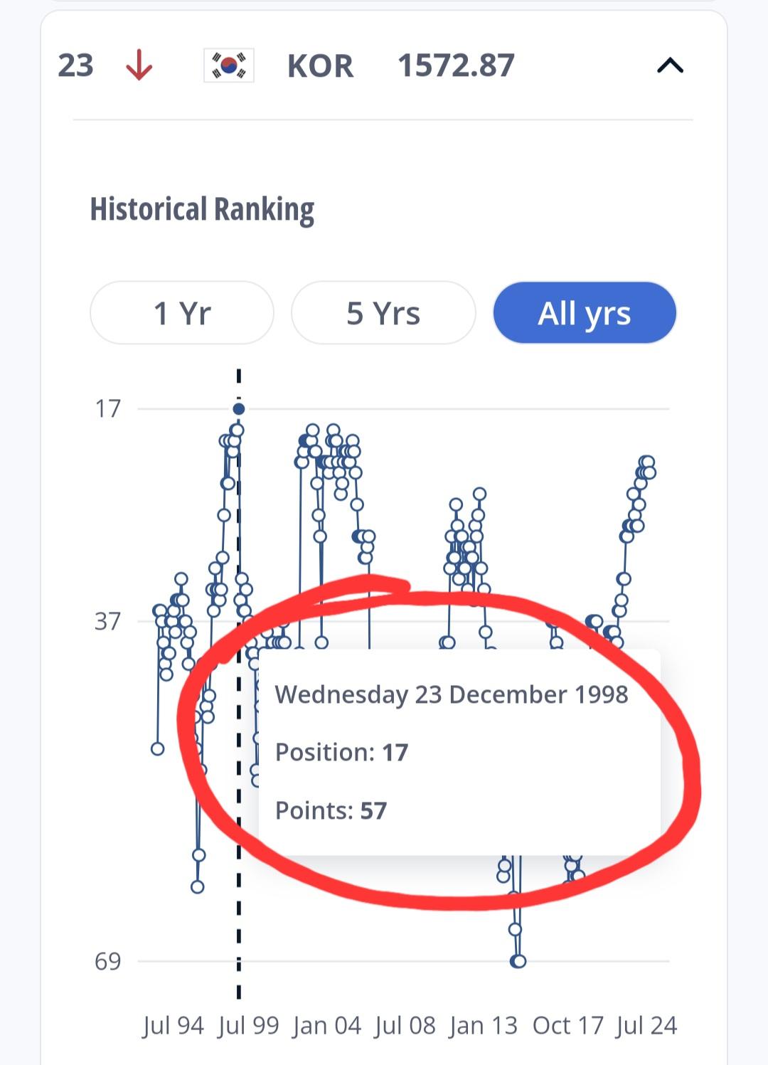 우리나라의 역대 피파 랭킹은 1998년 12월 23일 발표에서에 17위까지 올라간 적이 있습니다.