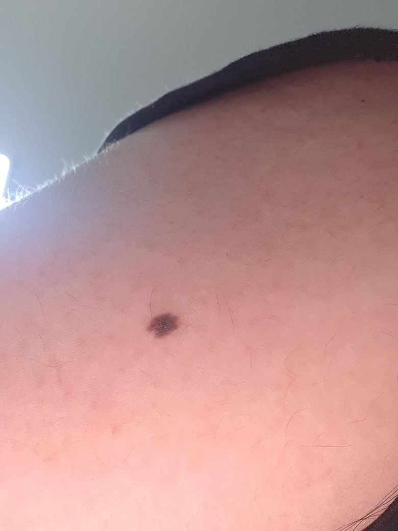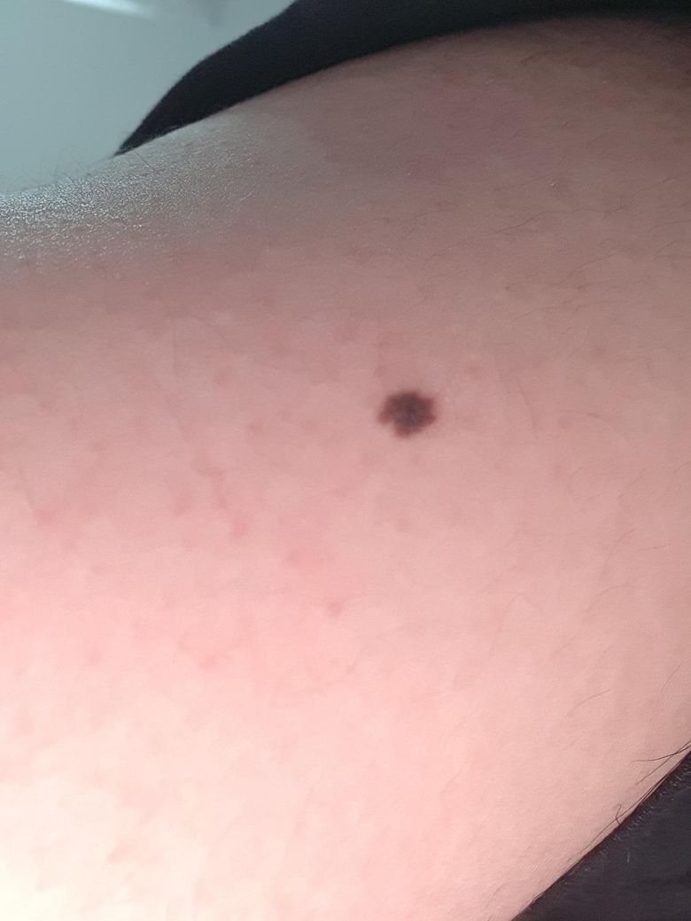 최근 팔 뒤쪽에 있어 안보이던 점을 찾게 됬는데 모양도 불균형에 색도 이상해서 걱정이 됩니다 지름은 5mm정도인데 아직까진 정확히 모르겠습니다