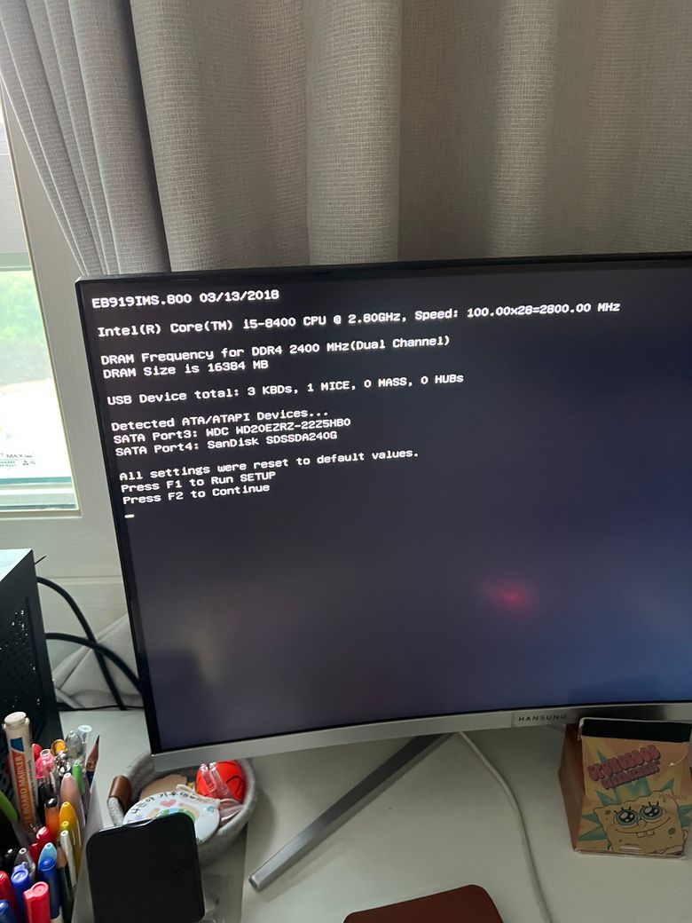 그래도 마찬가지로 같은 현상이 발생한다면 파워서플라이에 꽂힌 전원케이블을 뽑고 메인보드의 그래픽카드를 제거후 메인보드에 박혀있는 수은전지를 뽑은상태로 약 5분에서 10분정도 경과후 다시 배터리를 꽂고 그래픽카드도 다시 조립해 부팅을 해보시고요