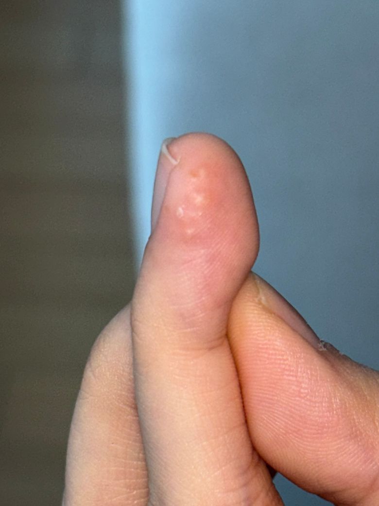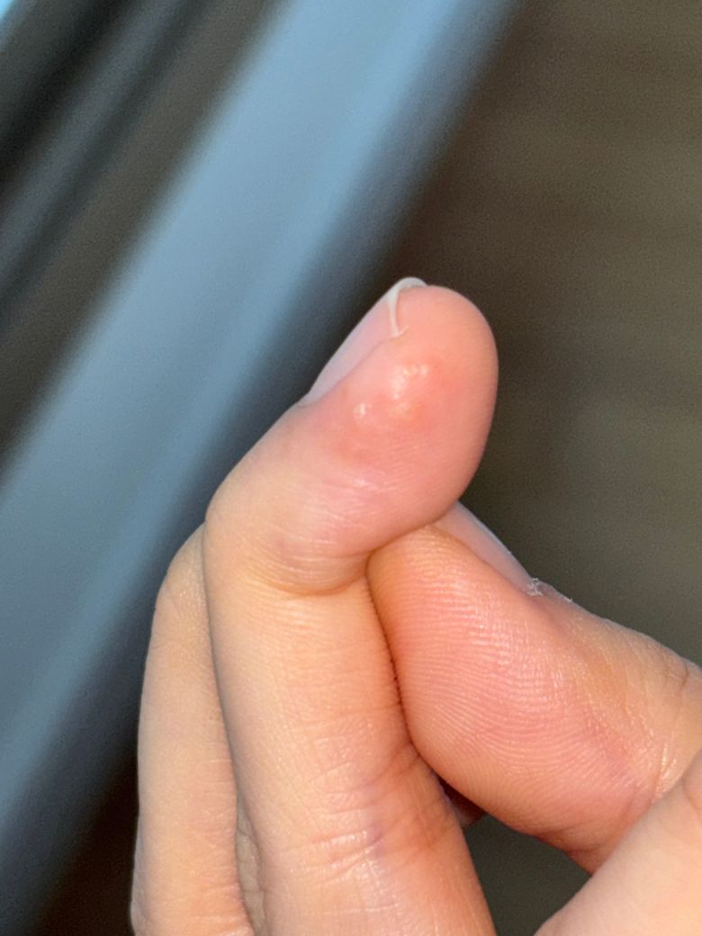 손가락이 몇일전부터 살짝 물집잡힌듯하게 부어있더니 갑자기 수포같은게 올라와서 이게 뭥까요???