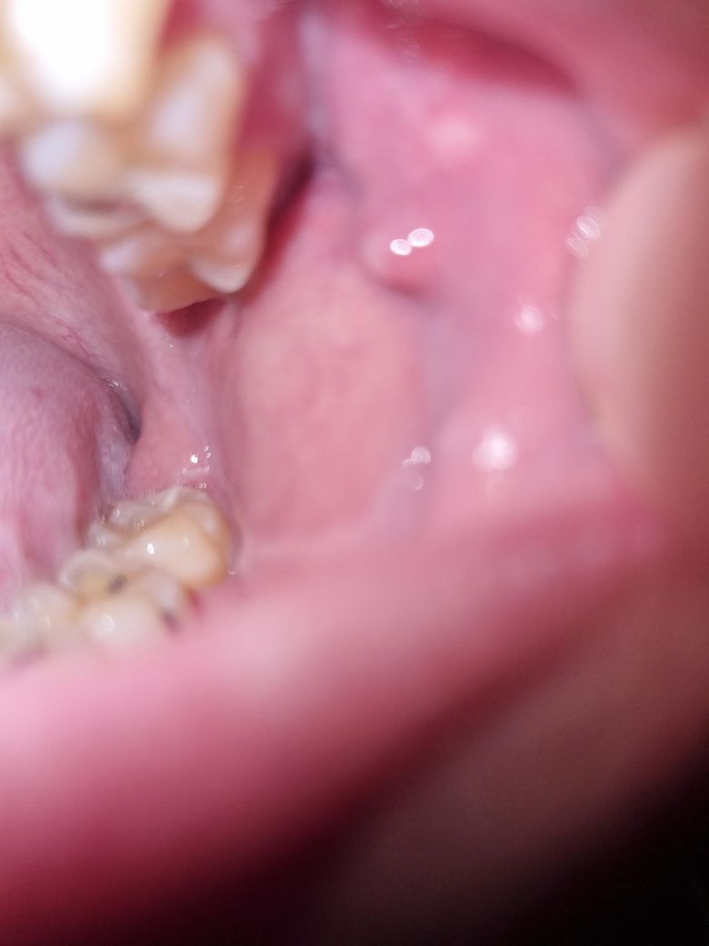 해당 부분은 정상적인 구조물로 구강 내에 존재하는 침샘 중 하나입니다. 잇몸 상태에 따라서 두드러지게 보일 수 있고 묻혀서 보이지 않을 수 있습니다. 정상적인 구강 내 조직이므로 크게 걱정하지 않으셔도 됩니다.